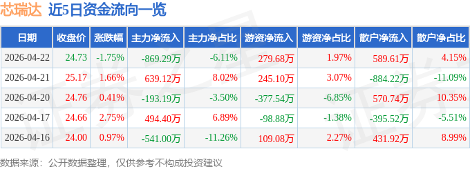 证券之星消息,截至2026年4月22日收盘,芯瑞达(002983)报收于24.73元,下跌1.75%,换手率4.58%,成交量5.87万手,成交额1.42亿元。
