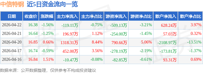 证券之星消息,截至2026年4月22日收盘,中信特钢(000708)报收于16.38元,下跌1.56%,换手率0.19%,成交量9.59万手,成交额1.58亿元。