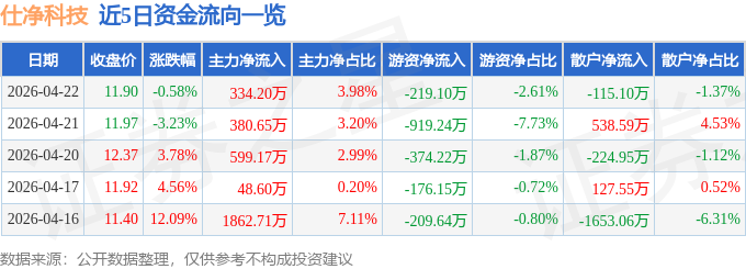 证券之星消息,截至2026年4月22日收盘,仕净科技(301030)报收于11.9元,下跌0.58%,换手率3.47%,成交量7.02万手,成交额8391.93万元。