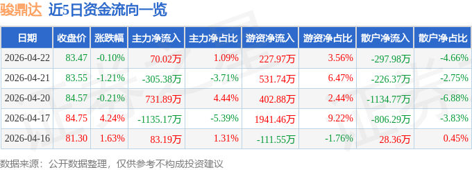 证券之星消息,截至2026年4月22日收盘,骏鼎达(301538)报收于83.47元,下跌0.1%,换手率2.46%,成交量7691.0手,成交额6395.36万元。