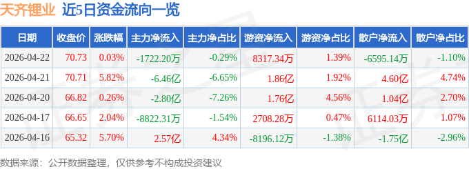证券之星消息,截至2026年4月22日收盘,天齐锂业(002466)报收于70.73元,上涨0.03%,换手率5.79%,成交量85.37万手,成交额60.0亿元。