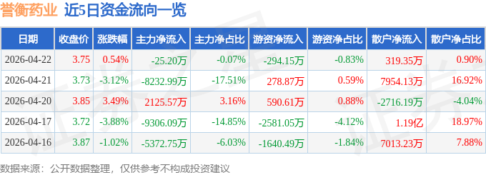 证券之星消息,截至2026年4月22日收盘,誉衡药业(002437)报收于3.75元,上涨0.54%,换手率4.61%,成交量96.2万手,成交额3.57亿元。