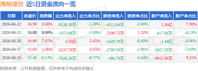 证券之星消息,截至2026年4月22日收盘,海格通信(002465)报收于16.9元,上涨0.6%,换手率3.8%,成交量94.25万手,成交额15.85亿元。