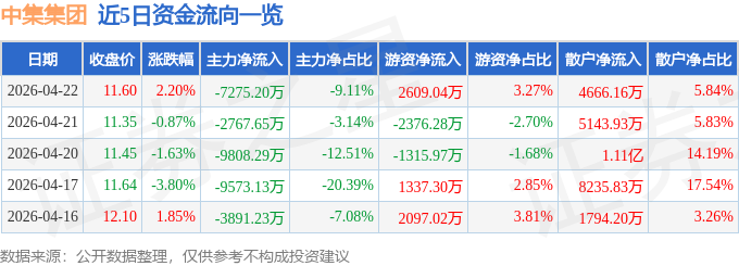 证券之星消息,截至2026年4月22日收盘,中集集团(000039)报收于11.6元,上涨2.2%,换手率3.05%,成交量70.24万手,成交额7.98亿元。
