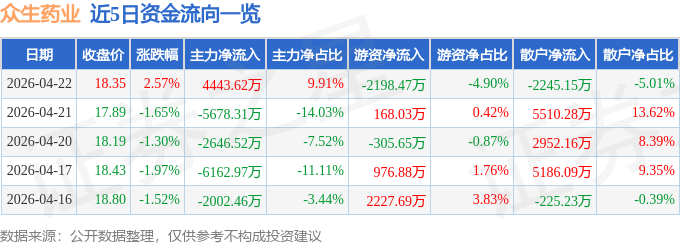 证券之星消息,截至2026年4月22日收盘,众生药业(002317)报收于18.35元,上涨2.57%,换手率3.26%,成交量24.85万手,成交额4.49亿元。
