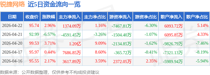 证券之星消息,截至2026年4月22日收盘,锐捷网络(301165)报收于95.74元,上涨2.96%,换手率1.57%,成交量12.51万手,成交额11.85亿元。
