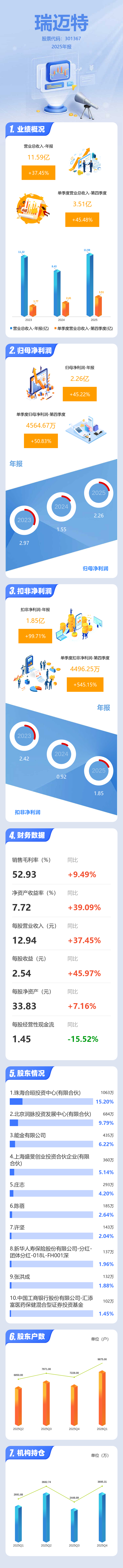 证券之星消息,瑞迈特2025年年报显示,当年度公司主营收入11.59亿元,同比上升37.46%;归母净利润2.26亿元,同比上升45.23%;扣非净利润1.85亿元,同比上升99.72%;其中2025年第四季度,公司单季度主营收入3.51亿元,同比上升45.49%;单季度归母净利润4564.67万元,同比上升50.84%;单季度扣非净利润4496.25万元,同比上升545.15%;负债率10.09%,投资收益4272.24万元,财务费用156.93万元,毛利率52.93%。