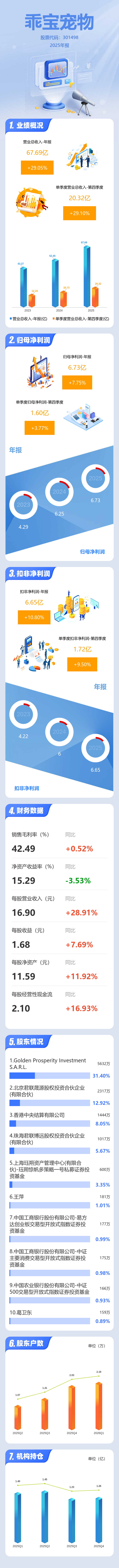 证券之星消息,乖宝宠物2025年年报显示,当年度公司主营收入67.69亿元,同比上升29.06%;归母净利润6.73亿元,同比上升7.75%;扣非净利润6.65亿元,同比上升10.8%;其中2025年第四季度,公司单季度主营收入20.32亿元,同比上升29.11%;单季度归母净利润1.6亿元,同比上升3.78%;单季度扣非净利润1.72亿元,同比上升9.51%;负债率20.45%,投资收益3112.52万元,财务费用-857.79万元,毛利率42.49%。