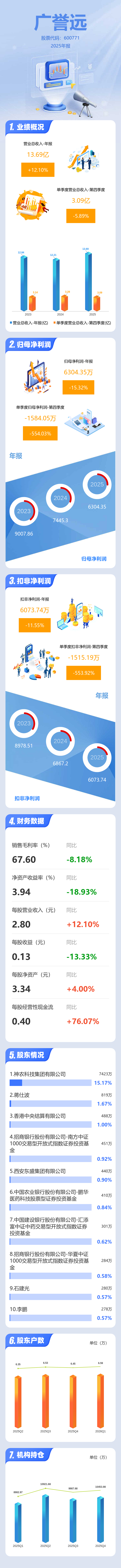 证券之星消息,广誉远2025年年报显示,当年度公司主营收入13.69亿元,同比上升12.11%;归母净利润6304.35万元,同比下降15.32%;扣非净利润6073.74万元,同比下降11.55%;其中2025年第四季度,公司单季度主营收入3.09亿元,同比下降5.89%;单季度归母净利润-1584.05万元,同比下降554.04%;单季度扣非净利润-1515.19万元,同比下降553.92%;负债率32.16%,投资收益-225.94万元,财务费用169.68万元,毛利率67.6%。