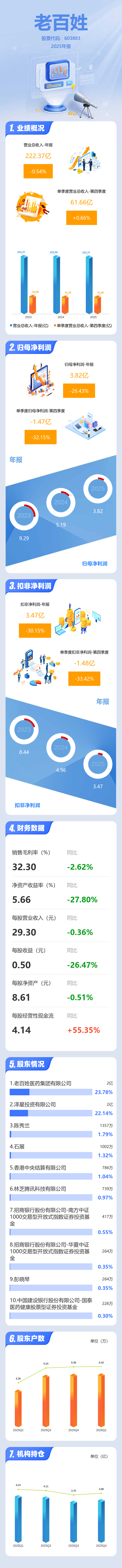 证券之星消息,老百姓2025年年报显示,当年度公司主营收入222.37亿元,同比下降0.54%;归母净利润3.82亿元,同比下降26.44%;扣非净利润3.47亿元,同比下降30.15%;其中2025年第四季度,公司单季度主营收入61.66亿元,同比上升0.66%;单季度归母净利润-1.47亿元,同比下降32.15%;单季度扣非净利润-1.48亿元,同比下降33.43%;负债率64.75%,投资收益89.68万元,财务费用1.3亿元,毛利率32.3%。