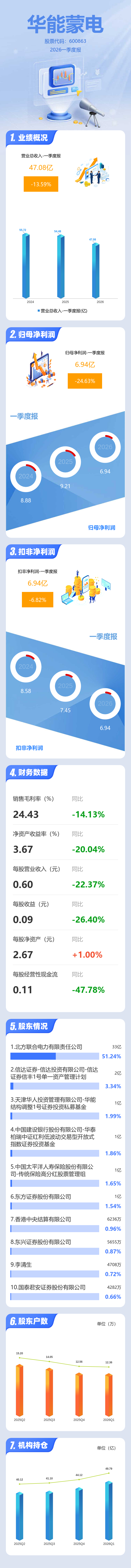 证券之星消息,华能蒙电2026年一季报显示,一季度公司主营收入47.08亿元,同比下降13.6%;归母净利润6.94亿元,同比下降24.63%;扣非净利润6.94亿元,同比下降6.82%;负债率39.65%,投资收益9899.55万元,财务费用6310.63万元,毛利率24.43%。