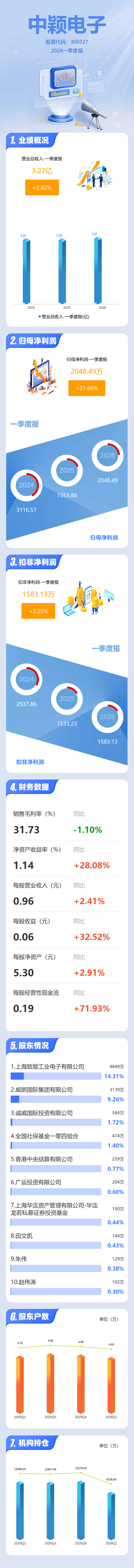 证券之星消息,中颖电子2026年一季报显示,一季度公司主营收入3.27亿元,同比上升2.42%;归母净利润2048.49万元,同比上升31.66%;扣非净利润1583.13万元,同比上升3.25%;负债率15.23%,投资收益32.52万元,财务费用-65.46万元,毛利率31.73%。