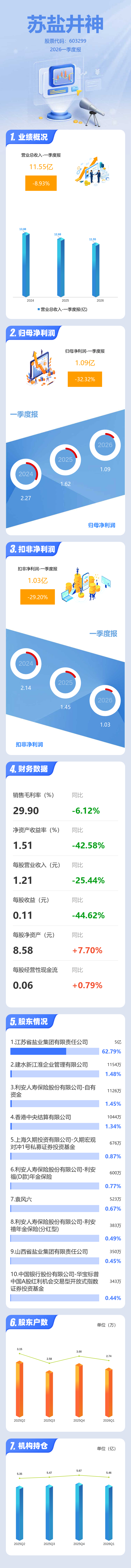 证券之星消息,苏盐井神2026年一季报显示,一季度公司主营收入11.55亿元,同比下降8.93%;归母净利润1.09亿元,同比下降32.33%;扣非净利润1.03亿元,同比下降29.2%;负债率37.93%,投资收益9.05万元,财务费用-148.42万元,毛利率29.9%。