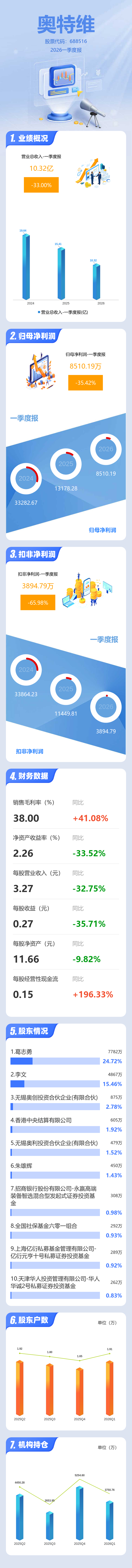 证券之星消息,奥特维2026年一季报显示,一季度公司主营收入10.32亿元,同比下降33.01%;归母净利润8510.19万元,同比下降35.42%;扣非净利润3894.79万元,同比下降65.98%;负债率72.92%,投资收益-481.66万元,财务费用2224.08万元,毛利率38.0%。