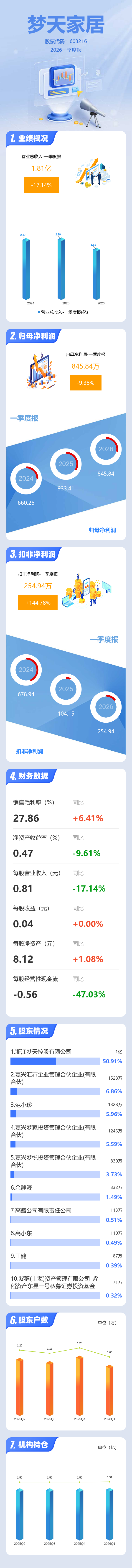 证券之星消息,梦天家居2026年一季报显示,一季度公司主营收入1.81亿元,同比下降17.15%;归母净利润845.84万元,同比下降9.38%;扣非净利润254.94万元,同比上升144.78%;负债率17.69%,投资收益66.9万元,财务费用-7.23万元,毛利率27.86%。