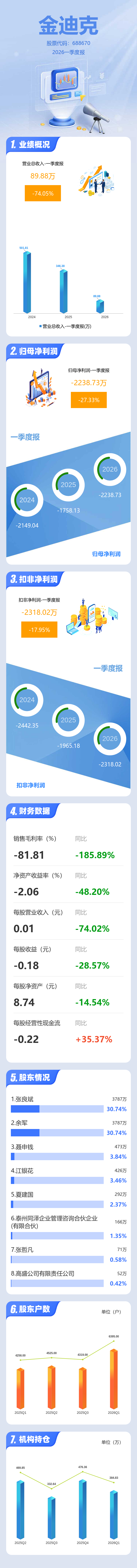 证券之星消息,金迪克2026年一季报显示,一季度公司主营收入89.88万元,同比下降74.05%;归母净利润-2238.73万元,同比下降27.34%;扣非净利润-2318.02万元,同比下降17.95%;负债率20.59%,投资收益111.33万元,财务费用53.48万元,毛利率-81.81%。