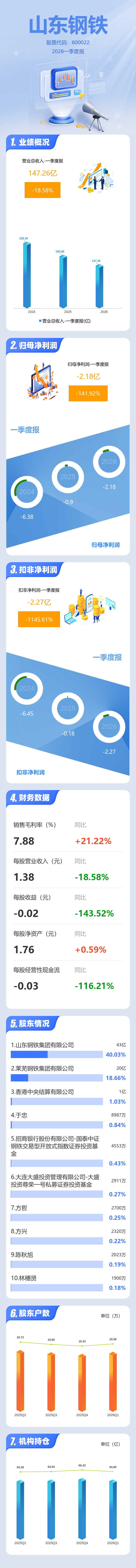 证券之星消息,山东钢铁2026年一季报显示,一季度公司主营收入147.26亿元,同比下降18.59%;归母净利润-2.18亿元,同比下降141.92%;扣非净利润-2.27亿元,同比下降1145.61%;负债率65.16%,投资收益4402.21万元,财务费用1.31亿元,毛利率7.88%。