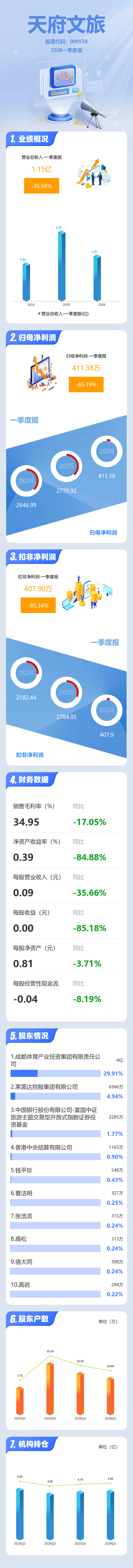 证券之星消息,天府文旅2026年一季报显示,一季度公司主营收入1.15亿元,同比下降35.66%;归母净利润411.38万元,同比下降85.2%;扣非净利润407.9万元,同比下降85.35%;负债率52.76%,投资收益-18.25万元,财务费用879.8万元,毛利率34.95%。
