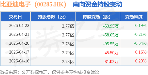 证券之星消息,4月22日南向资金减持53.95万股比亚迪电子(00285.HK)。近5个交易日中,获南向资金减持的有3天,累计净减持81.03万股。近20个交易日中,获南向资金增持的有13天,累计净增持1260.3万股。截至目前,南向资金持有比亚迪电子(00285.HK)2.77亿股,占公司已发行普通股的12.27%。