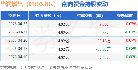 证券之星消息,4月22日南向资金增持9.56万股华润燃气(01193.HK)。近5个交易日中,获南向资金减持的有3天,累计净减持33.2万股。近20个交易日中,获南向资金减持的有15天,累计净减持822.41万股。截至目前,南向资金持有华润燃气(01193.HK)4.92亿股,占公司已发行普通股的21.27%。