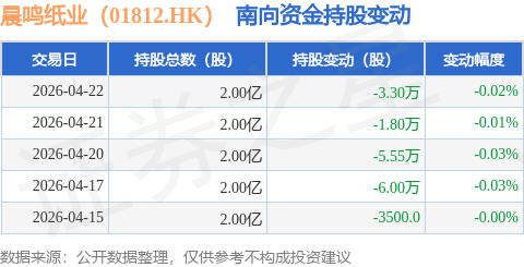 证券之星消息,4月22日南向资金减持3.3万股晨鸣纸业(01812.HK)。近5个交易日中,获南向资金减持的有5天,累计净减持17.0万股。近20个交易日中,获南向资金减持的有20天,累计净减持202.8万股。截至目前,南向资金持有晨鸣纸业(01812.HK)2.0亿股,占公司已发行普通股的37.82%。