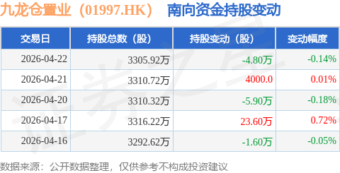 证券之星消息,4月22日南向资金减持4.8万股九龙仓置业(01997.HK)。近5个交易日中,获南向资金增持的有2天,累计净增持11.7万股。近20个交易日中,获南向资金增持的有9天,累计净增持10.2万股。截至目前,南向资金持有九龙仓置业(01997.HK)3305.92万股,占公司已发行普通股的1.08%。