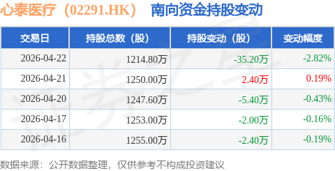 证券之星消息,4月22日南向资金减持35.2万股心泰医疗(02291.HK)。近5个交易日中,获南向资金减持的有4天,累计净减持42.6万股。近20个交易日中,获南向资金增持的有10天,累计净增持48.0万股。截至目前,南向资金持有心泰医疗(02291.HK)1214.8万股,占公司已发行普通股的3.49%。
