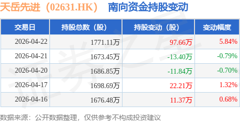 证券之星消息,4月22日南向资金增持97.66万股天岳先进(02631.HK)。近5个交易日中,获南向资金增持的有3天,累计净增持106.0万股。近20个交易日中,获南向资金增持的有8天,累计净增持55.31万股。截至目前,南向资金持有天岳先进(02631.HK)1771.11万股,占公司已发行普通股的32.25%。