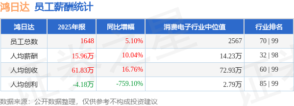 证券之星消息,4月23日鸿日达公布2025年年报,当年营收10.19亿元,同比增22.72%;净利润为-6722.67万元,同比减787.74%。根据财报数据披露,当年公司员工总数1648人,同比增5.1%;人均薪酬15.96万元,同比增10.04%;人均创收61.83万元,同比增16.76%;公司员工薪酬统计见下表: