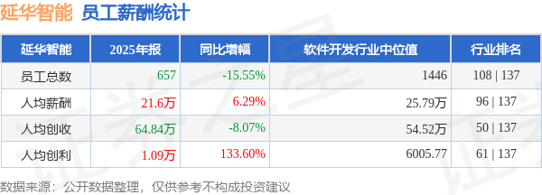证券之星消息,4月23日延华智能公布2025年年报,当年营收4.26亿元,同比减22.37%;净利润为894.88万元,同比增142.02%。根据财报数据披露,当年公司员工总数657人,同比减15.55%;人均薪酬21.6万元,同比增6.29%;人均创收64.84万元,同比减8.07%;人均创利1.09万元,同比增133.6%;公司员工薪酬统计见下表: