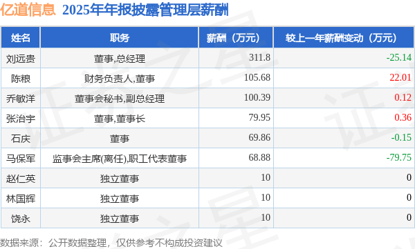 证券之星消息,亿道信息发布2025年年报,数据显示:公司主营收入45.83亿元,同比增44.15%。归母净利润为6535.91万元,同比增91.76%。扣非净利润为6026.08万元,同比增222.49%。当年公司员工总数1633人,同比增9.82%。人均薪酬25.14万元(注:"人均薪酬"根据定期报告中"应付职工薪酬"附注的本期增加值 / 员工总数计算而来),同比增14.69%。人均创收280.68万元,同比增31.26%。人均创利3.79万元,同比增70.37%。其中管理层薪酬总额为766.56万元,同比上一年减16.76%,薪酬最高的为董事,总经理刘远贵,薪酬311.8万元。