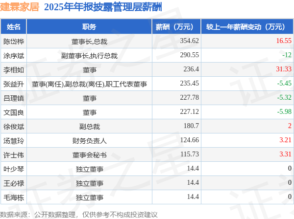 证券之星消息,建霖家居发布2025年年报,数据显示:公司主营收入51.19亿元,同比增2.25%。归母净利润为4.41亿元,同比减8.55%。扣非净利润为3.98亿元,同比减14.3%。当年公司员工总数7586人,同比增11.77%。人均薪酬13.88万元(注:"人均薪酬"根据定期报告中"应付职工薪酬"附注的本期增加值 / 员工总数计算而来),同比减5.37%。人均创收67.48万元,同比减8.52%。人均创利5.82万元,同比减17.77%。其中管理层薪酬总额为2036.21万元,同比上一年减3.64%,薪酬最高的为董事长,总裁陈岱桦,薪酬354.62万元。