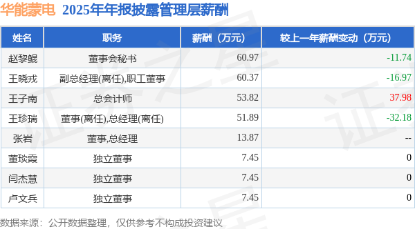 证券之星消息,华能蒙电发布2025年年报,数据显示:公司主营收入210.5亿元,同比减11.76%。归母净利润为24.93亿元,同比减17.97%。扣非净利润为18.58亿元,同比减17.5%。当年公司员工总数5475人,同比减1.24%。人均薪酬49.03万元(注:"人均薪酬"根据定期报告中"应付职工薪酬"附注的本期增加值 / 员工总数计算而来),同比增9.18%。人均创收384.48万元,同比减4.39%。人均创利59.19万元,同比增39.11%。其中管理层薪酬总额为263.27万元,同比上一年减34.17%,薪酬最高的为董事会秘书赵黎鲲,薪酬60.97万元。