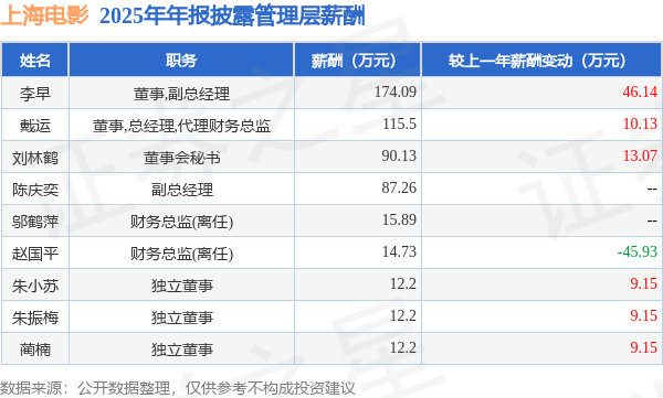 证券之星消息,上海电影发布2025年年报,数据显示:公司主营收入9.18亿元,同比增33.02%。归母净利润为1.13亿元,同比增25.38%。扣非净利润为7971.85万元,同比增359.19%。当年公司员工总数673人,同比减1.46%。人均薪酬21.27万元(注:"人均薪酬"根据定期报告中"应付职工薪酬"附注的本期增加值 / 员工总数计算而来),同比增12.7%。人均创收136.45万元,同比增35.0%。人均创利22.19万元,同比增25.61%。其中管理层薪酬总额为534.2万元,同比上一年增13.37%,薪酬最高的为董事,副总经理李早,薪酬174.09万元。