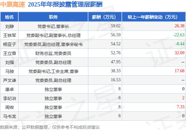 证券之星消息,中原高速发布2025年年报,数据显示:公司主营收入65.99亿元,同比减5.31%。归母净利润为6.28亿元,同比减29.13%。扣非净利润为4.82亿元,同比减43.34%。当年公司员工总数2625人,同比减14.19%。人均薪酬31.41万元(注:"人均薪酬"根据定期报告中"应付职工薪酬"附注的本期增加值 / 员工总数计算而来),同比增18.91%。人均创收251.38万元,同比增10.34%。人均创利23.93万元,同比减16.87%。其中管理层薪酬总额为357.7万元,同比上一年减33.36%,薪酬最高的为党委书记,董事长刘静,薪酬59.02万元。