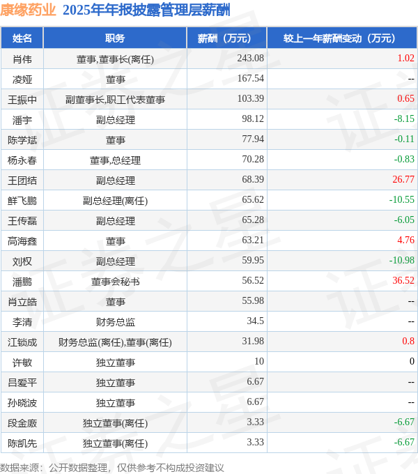 证券之星消息,康缘药业发布2025年年报,数据显示:公司主营收入32.93亿元,同比减15.52%。归母净利润为3.04亿元,同比减22.44%。扣非净利润为2.17亿元,同比减40.18%。当年公司员工总数5379人,同比减12.28%。人均薪酬13.31万元(注:"人均薪酬"根据定期报告中"应付职工薪酬"附注的本期增加值 / 员工总数计算而来),同比增1.61%。人均创收61.22万元,同比减3.69%。人均创利5.71万元,同比减8.03%。其中管理层薪酬总额为1291.78万元,同比上一年增20.34%,薪酬最高的为董事,董事长(离任)肖伟,薪酬243.08万元。