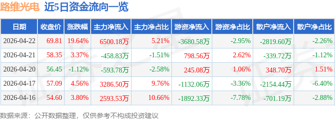 证券之星消息,截至2026年4月22日收盘,路维光电(688401)报收于69.81元,上涨19.64%,换手率9.64%,成交量18.64万手,成交额12.48亿元。