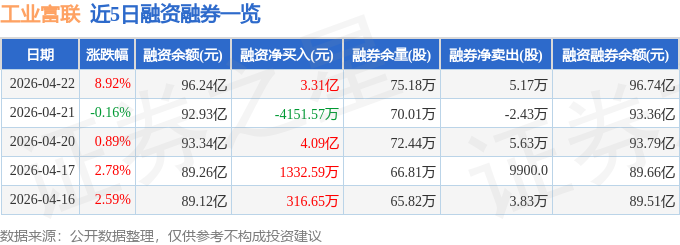 工业富联融资融券信息显示,融资方面,当日融资买入20.49亿元,融资偿还17.18亿元,融资净买入3.31亿元,净买入额两市排名第4。融券方面,融券卖出5.7万股,融券偿还5300.0股,融券余量75.18万股,融券余额5029.06万元。融资融券余额96.74亿元。