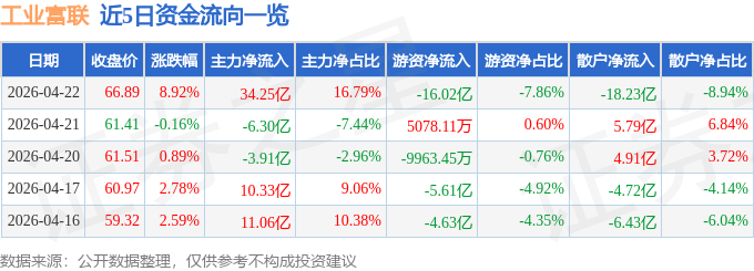 证券之星消息,截至2026年4月22日收盘,工业富联(601138)报收于66.89元,上涨8.92%,换手率1.59%,成交量316.08万手,成交额203.98亿元。