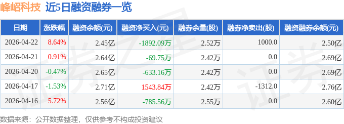 峰岹科技融资融券信息显示,融资方面,当日融资买入2190.41万元,融资偿还4082.5万元,融资净偿还1892.09万元。融券方面,融券卖出1000.0股,融券偿还0.0股,融券余量2.52万股,融券余额491.05万元。融资融券余额2.5亿元。