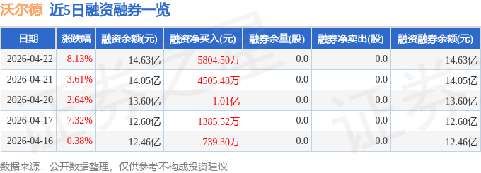 沃尔德融资融券信息显示,融资方面,当日融资买入2.22亿元,融资偿还1.64亿元,融资净买入5804.5万元,连续3日净买入累计2.04亿元。融券方面,融券卖出0.0股,融券偿还0.0股,融券余量0.0股,融券余额0.0万元。融资融券余额14.63亿元。