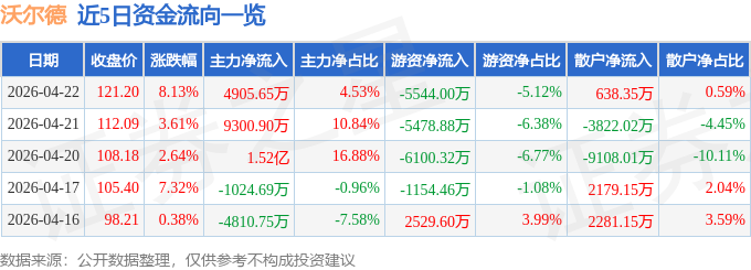 证券之星消息,截至2026年4月22日收盘,沃尔德(688028)报收于121.2元,上涨8.13%,换手率6.09%,成交量9.19万手,成交额10.82亿元。