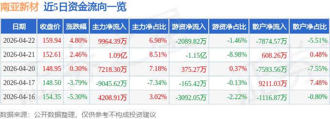 证券之星消息,截至2026年4月22日收盘,南亚新材(688519)报收于159.94元,上涨4.8%,换手率3.96%,成交量9.29万手,成交额14.28亿元。