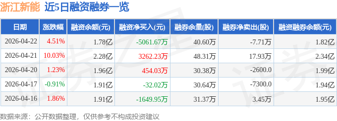 浙江新能融资融券信息显示,融资方面,当日融资买入8617.4万元,融资偿还1.37亿元,融资净偿还5061.67万元。融券方面,融券卖出1.32万股,融券偿还9.03万股,融券余量40.6万股,融券余额460.81万元。融资融券余额1.82亿元。