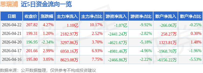 证券之星消息,截至2026年4月22日收盘,思瑞浦(688536)报收于207.82元,上涨4.27%,换手率3.87%,成交量5.26万手,成交额10.78亿元。