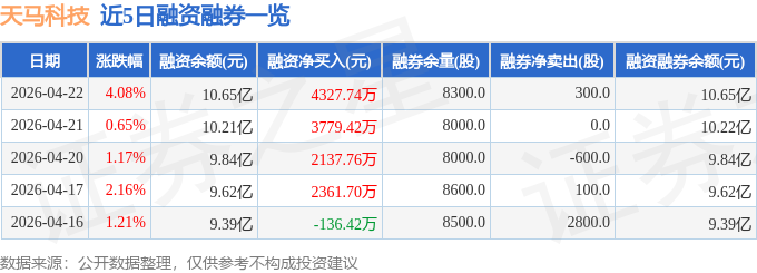 证券之星消息,截至2026年4月22日收盘,天马科技(603668)报收于14.54元,上涨4.08%,换手率2.78%,成交量14.05万手,成交额2.02亿元。