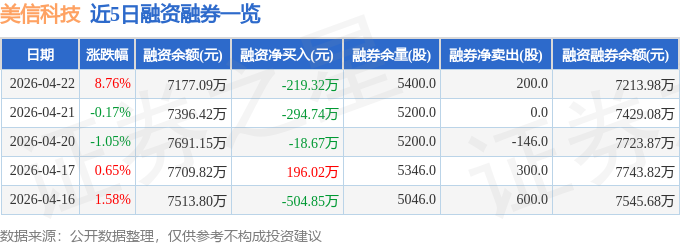 证券之星消息,截至2026年4月22日收盘,美信科技(301577)报收于68.31元,上涨8.76%,换手率18.14%,成交量3.42万手,成交额2.28亿元。