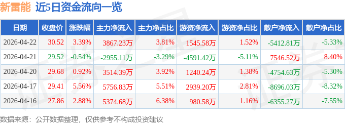 证券之星消息,截至2026年4月22日收盘,新雷能(300593)报收于30.52元,上涨3.39%,换手率7.45%,成交量33.53万手,成交额10.16亿元。