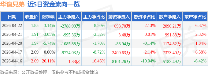 证券之星消息,截至2026年4月22日收盘,华谊兄弟(300027)报收于1.85元,下跌3.14%,换手率7.15%,成交量177.76万手,成交额3.28亿元。
