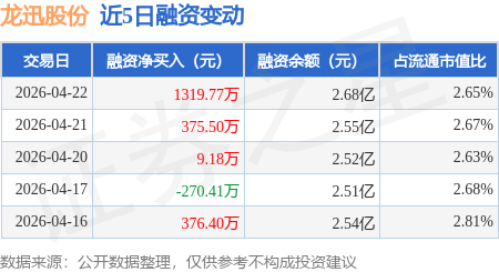 证券之星消息,4月22日,龙迅股份(688486)融资买入4465.99万元,融资偿还3146.22万元,融资净买入1319.77万元,融资余额2.68亿元,近3个交易日已连续净买入累计1704.45万元。
